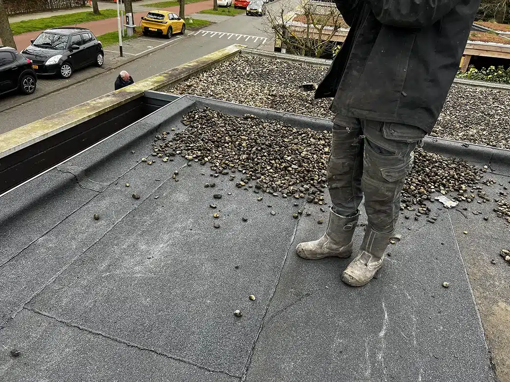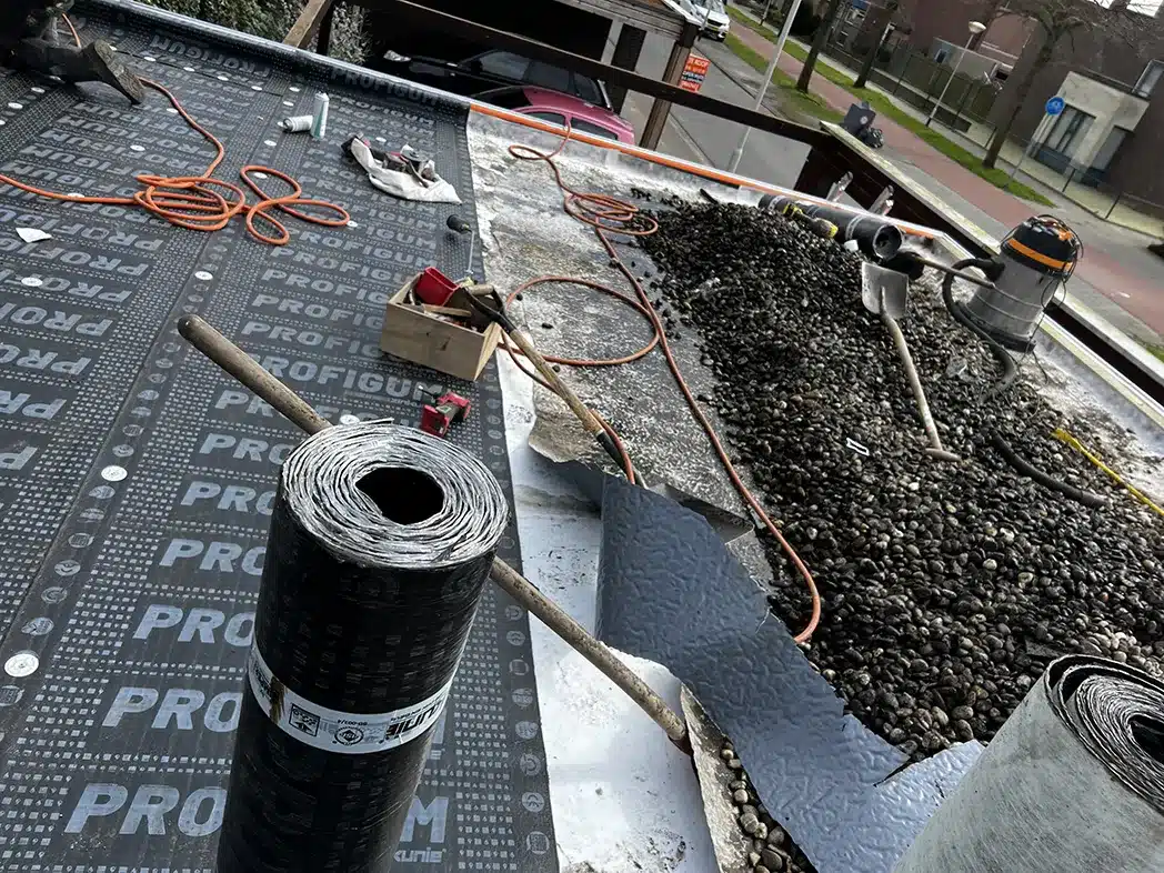 In Breda hebben wij het platdak van een schuur voorzien van een compleet nieuwe bitumen dakbedekking. De bestaande kunststof dakbedekking was verouderd en veroorzaakte lekkage. Om nieuwe schade te voorkomen heeft de klant gekozen voor een duurzame oplossing met materialen van onze vaste leverancier Zinkunie. Het dak is nu volledig waterdicht, strak afgewerkt en toekomstbestendig.