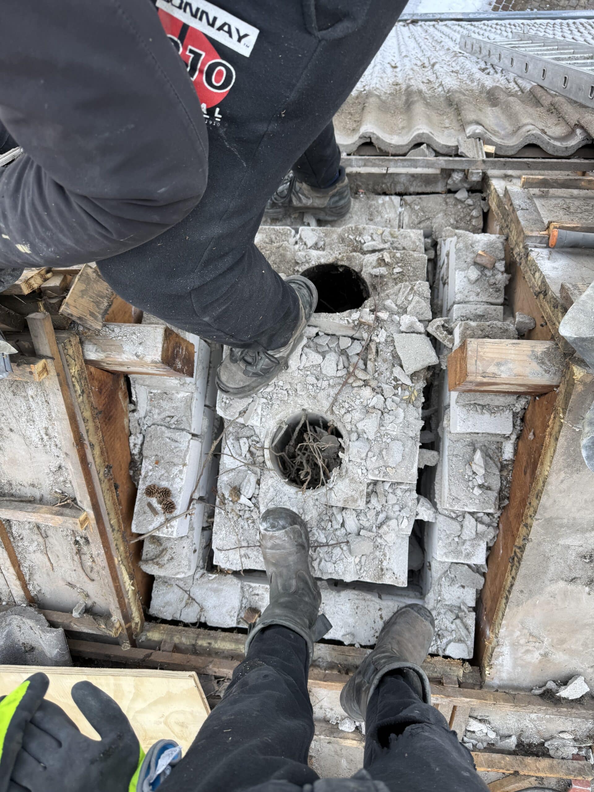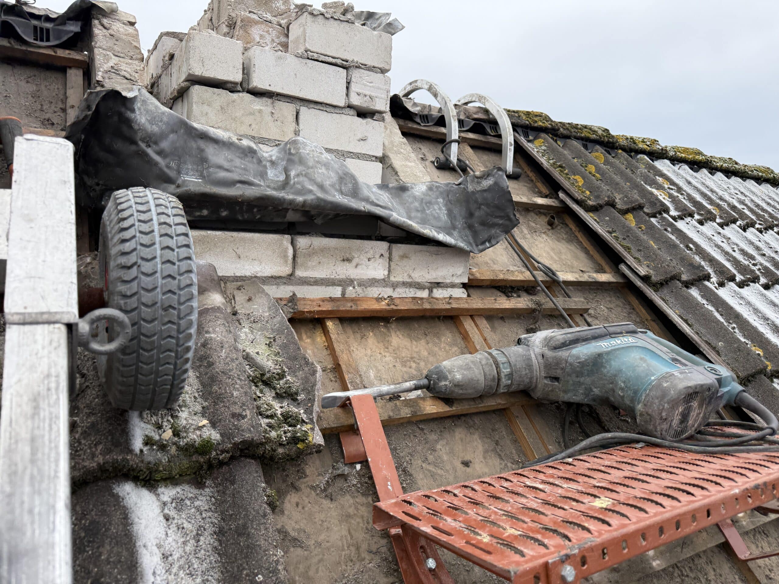 - • Volledig slopen en verwijderen van de schoorsteen boven het dak.
