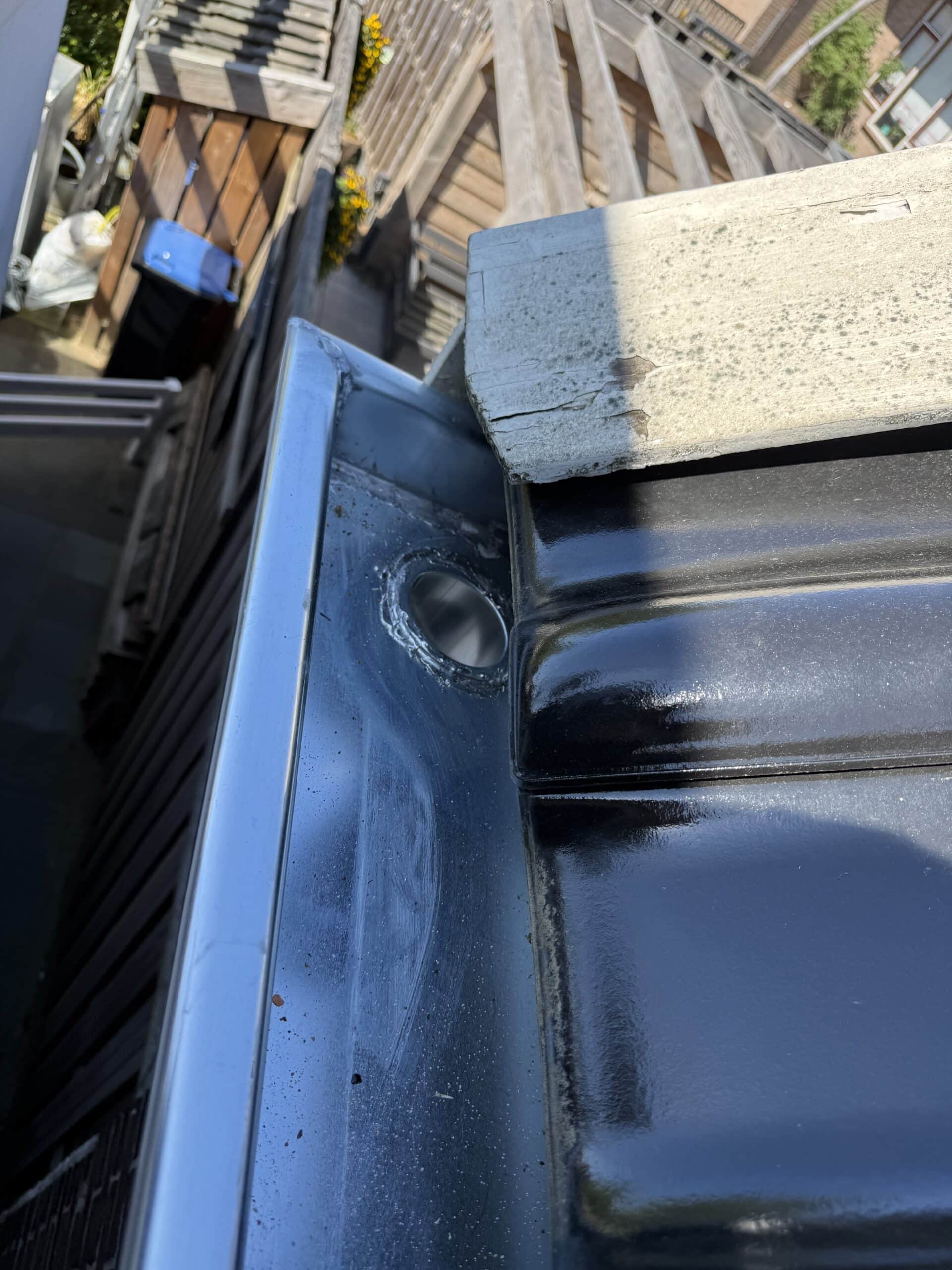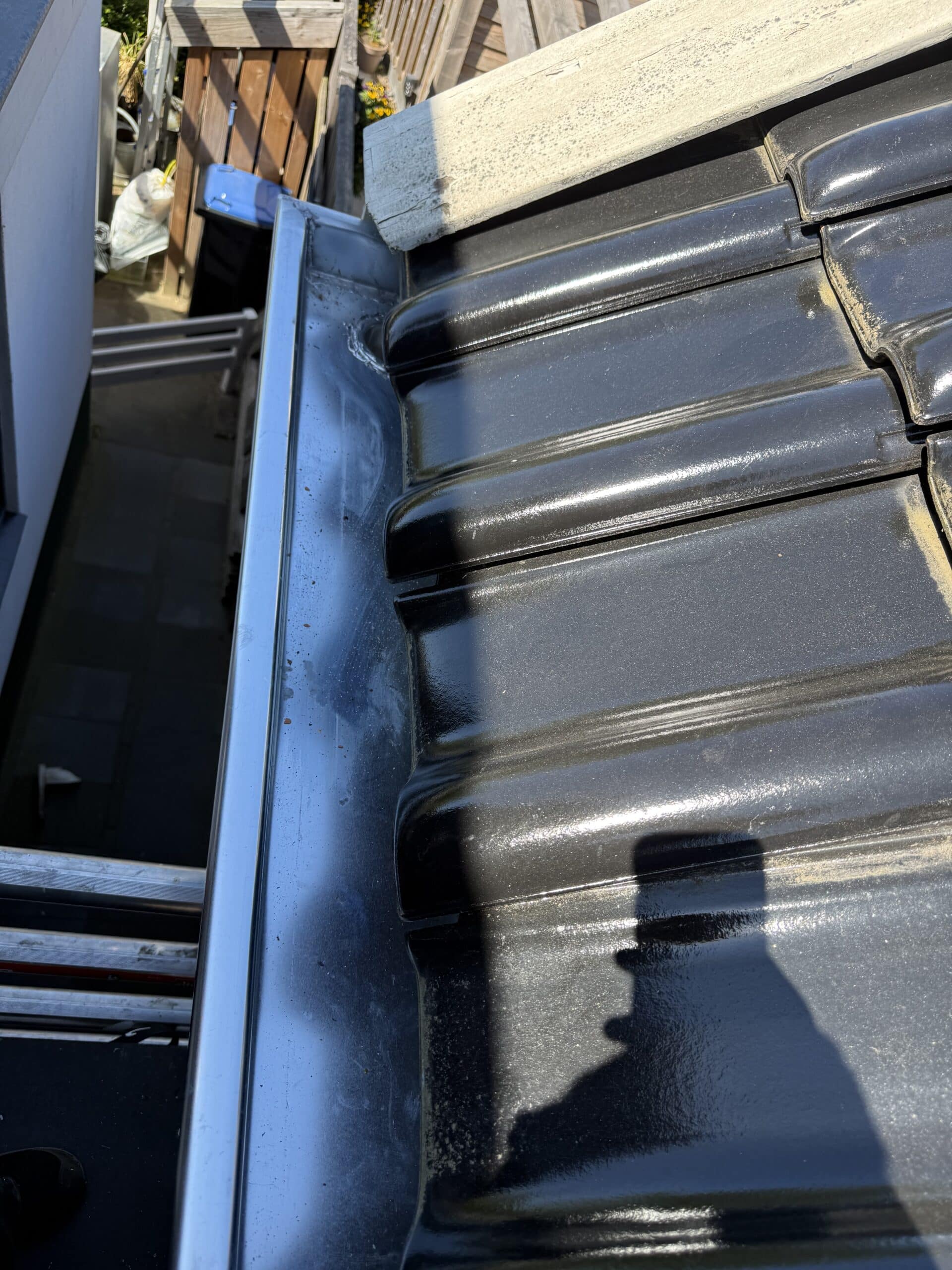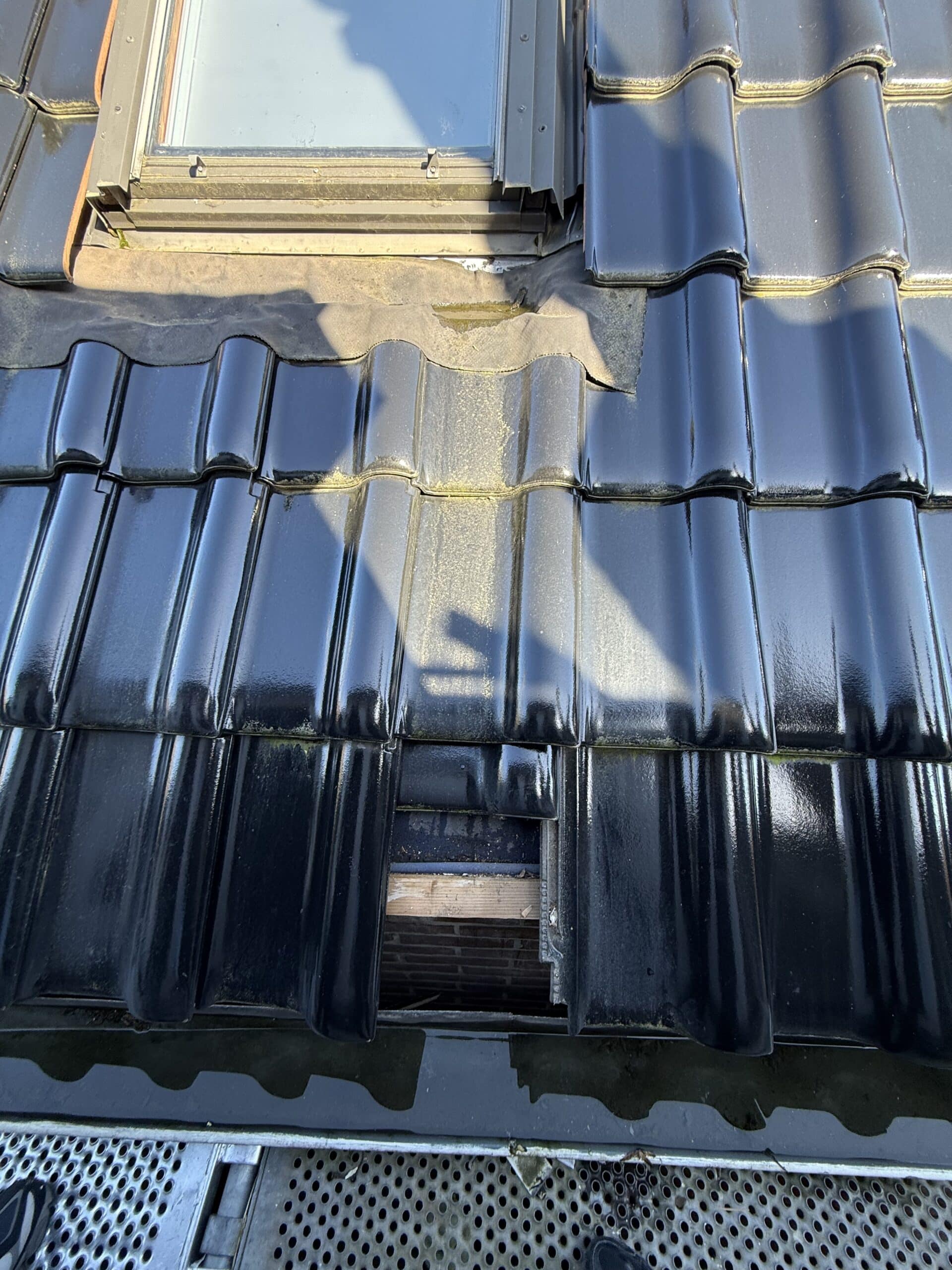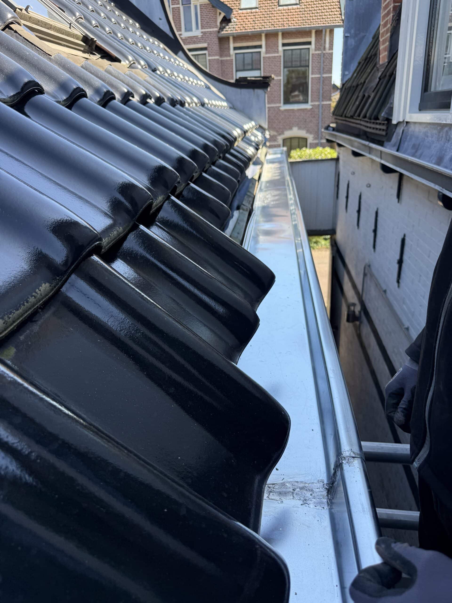 - Plaatsen van een nieuwe NedZink bakgoot B44 (Zinkunie), passend bij de overhelling van de dakpannen.